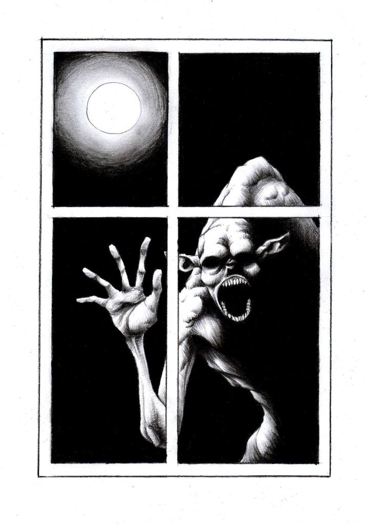 En la noche volvió a despertar; ya no le interesaba ver a las criaturas, pero como llevaba tantas noches consecutivas despertando a esa hora, la fuerza de la costumbre le abrió los ojos y la niña adivinó que tardaría un poco en poder quedarse dormida otra vez. Decidió que, si ya se había despertado de todos modos, bien podría ir a asomarse a la ventana. Sin embargo, esa vez fue distinto: vio a tres criaturas en la ventana fuera de su habitación. Caminó por el pasillo, intrigada; ahora había criaturas en todas las ventanas, en ninguna había menos de tres, en otras había tantas que era imposible ver siquiera el patio a sus espaldas. Cuando finalmente llegó ante la ventana donde había visto a las criaturas por primera vez no fue ninguna sorpresa ver ahí a cinco de ellas, mirando directamente al interior de la casa, como todas las demás.